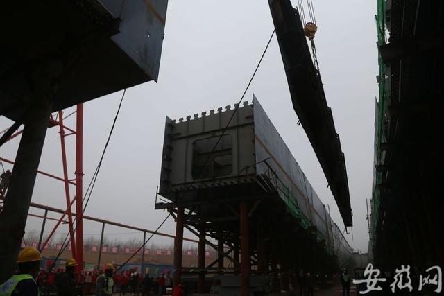 由于引江濟(jì)淮工程與G312合六葉公路相交,需新建一座公路橋跨越江淮運(yùn)河。記者在現(xiàn)場(chǎng)看到,大橋雛形已現(xiàn),工人們正在緊張施工。“G312合六葉公路橋全長(zhǎng)280米,總用鋼量達(dá)1.6萬噸,橋面總寬52.5米,最大跨度達(dá)180米、采用鋼箱梁結(jié)構(gòu),在同類鋼箱梁中主跨跨度居全國(guó)第二、安徽省第一?!敝需F五局引江濟(jì)淮項(xiàng)目負(fù)責(zé)人羅偉平介紹,鋼箱梁由四幅連續(xù)梁組成,每幅鋼箱梁采用100米+180米+100米的三跨結(jié)構(gòu)組成,其中3#、4#連續(xù)梁已于2020年4月份實(shí)現(xiàn)合龍。