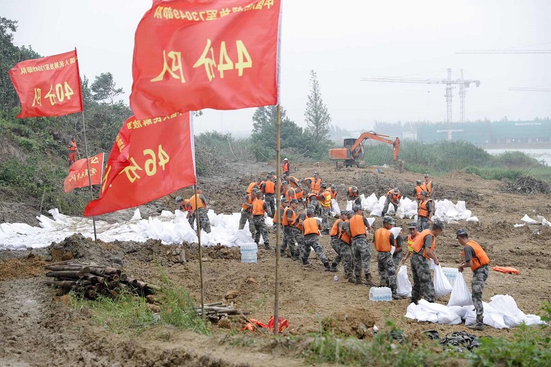 嚴(yán)店鄉(xiāng)蓮花圩派河大堤上,官兵奮戰(zhàn)在抗洪搶險(xiǎn)一線(xiàn)。