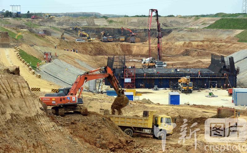 在引江濟(jì)淮工程安徽省合肥市廬江縣萬山鎮(zhèn)永橋村廬江船閘施工現(xiàn)場,中交第二航務(wù)工程局有限公司的建設(shè)者們用挖掘機(jī)正在緊張施工取土,運(yùn)輸土方工程車川流不息,船閘底部混凝土澆筑正在施工,建設(shè)現(xiàn)場一片繁忙景象。