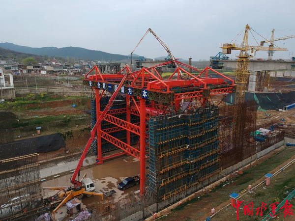 船閘施工現(xiàn)場四面環(huán)水,地質(zhì)條件差,施工難度大,工期緊,項目部管理人員在決戰(zhàn)疫情防控的同時統(tǒng)籌規(guī)劃,合理布局,積極配置各方資源,確保首次閘室墻混凝土澆筑作業(yè)圓滿成功。從前期施工準備到移動模架組裝,再到鋼筋綁扎、定型鋼模板拼裝、混凝土澆筑以及混凝土養(yǎng)護等各個工序,項目部實現(xiàn)安全技術(shù)層層交底,全體參建人員各司其職,相互配合。