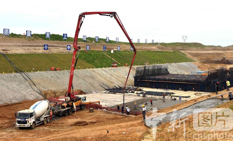 在引江濟(jì)淮工程安徽省合肥市廬江縣萬(wàn)山鎮(zhèn)永橋村廬江船閘施工現(xiàn)場(chǎng),中交第二航務(wù)工程局有限公司的建設(shè)者們用挖掘機(jī)正在緊張施工取土,運(yùn)輸土方工程車川流不息,船閘底部混凝土澆筑正在施工,建設(shè)現(xiàn)場(chǎng)一片繁忙景象。