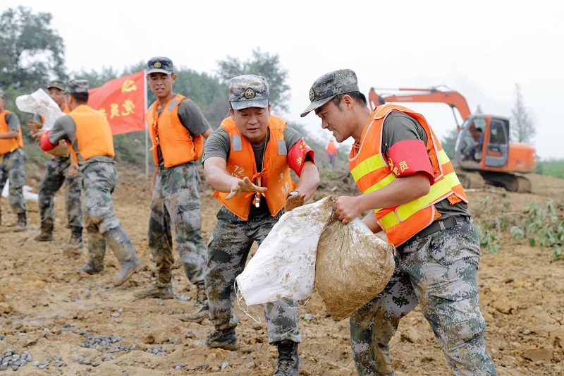 嚴(yán)店鄉(xiāng)蓮花圩派河大堤上,官兵奮戰(zhàn)在抗洪搶險(xiǎn)一線(xiàn)。